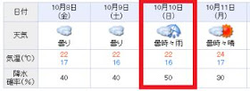 The weather forecast for our wedding day (10/10/2010) is highs in the upper 60Fs (20Cs), with 50% chance of precipitation :(