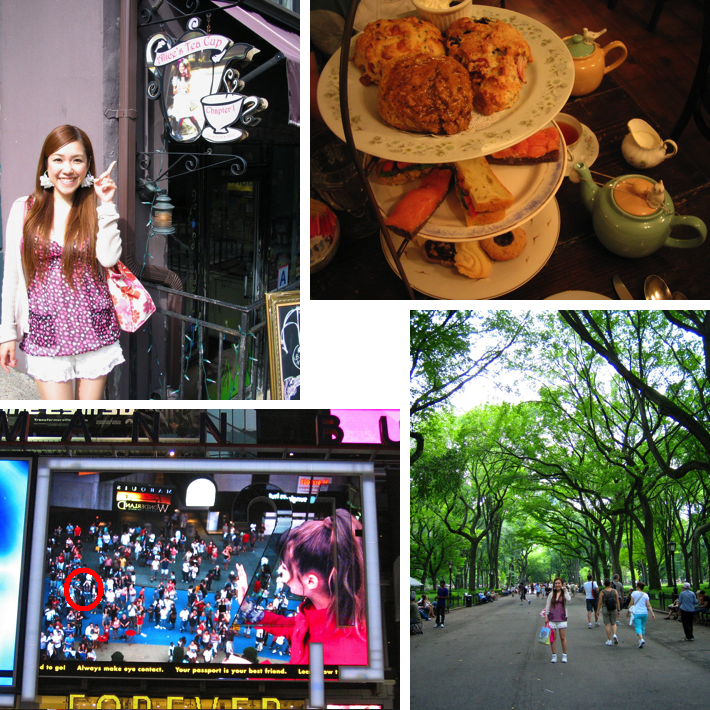 Day 4 (7/4):OMG! I finally found a place to try the 3-tiered afternoon tea!!! Alice's Afternoon Tea serves the afternoon tea menu before and after noon, which is cool :) So, we had The Mad Hatter menu (2 for $37). Their scones (especially the mixed berry) and sandwiches were amazingly delicious! Yay!!! Then we shopped upper west and walked down to the hotel through the central park. We had a dinner at Rock Center Cafe (as usual - we eat here every year). It's the place where my darling and I dated for the 2nd time. On the Broadway, we found cool Forever 21 electric bulletin board! Can you see us waving hands?! LoL We didn't join the crowds, so we kind of saw the July 4th fireworks from 42nd street. hehe