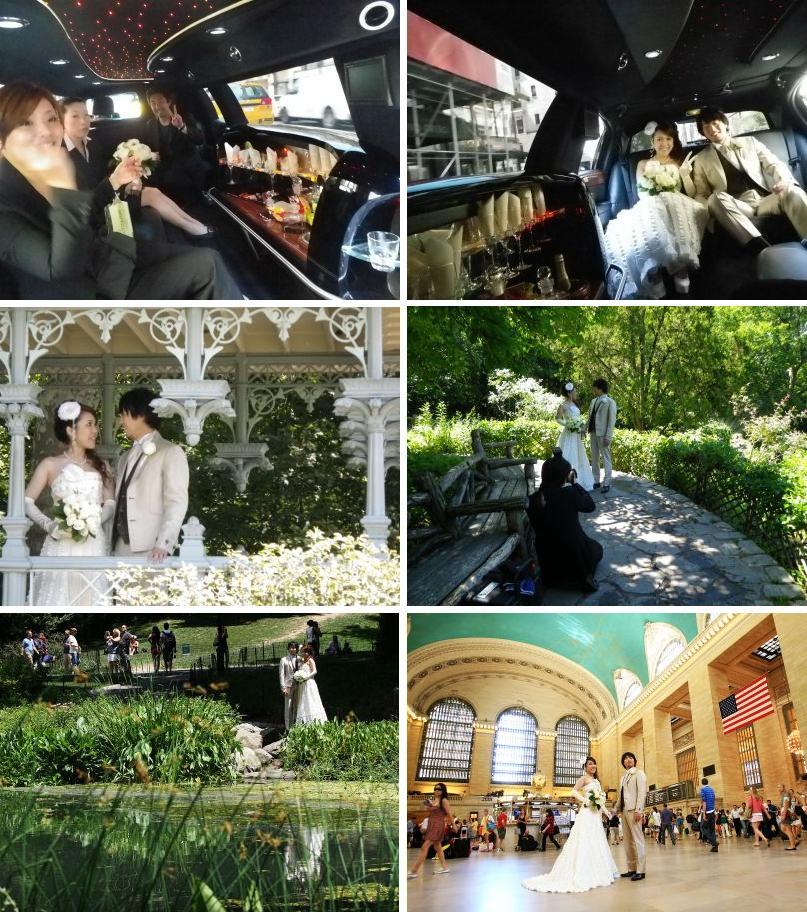 My makeup artist Kelly came to our room at 8AM. Meanwhile, my bouquet was delivered. It was huge but beautiful white roses. To tell the truth, it was still beautiful on the day we left New York. I wish I could take it back with me. At 10AM we took a limo to the Central Park. It was a perfect weather with blue skies which we have hoped. Of course we took the photo at the place where my darling proposed to me last year (left bottom image).