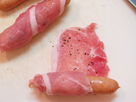 1. Work with one slice of pork at a time. Place the slice of pork so that the length of it is running flat and vertically towards you. Sprinkle a bit of salt and cracked black pepper onto one side and place the sausage on the end of the pork close to you and start rolling diagonally to cover the sausage. Repeat with the remaining pork slices and sausage.